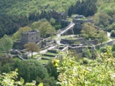 Im Jahre 926 erbauten fränkische Edelleute im Hahnenbachtal, auf einem Fels gelegen, eine Fluchtburg. Um 1030 wurde sie zum Wohnsitz der Wildgrafen von Schmidtburg und trägt auch seither deren Namen. In den Wirren der folgenden Jahrhunderte wechselte die sich stetig vergrößernde Burganlage des Öfteren die Besitzer, bis sie dann 1688 von französischen Soldaten im Pfälzischen Erbfolgekrieg gesprengt wurde. Die Ruinen der Oberburg wurden Mitte des 18. Jahrhunderts wiederaufgebaut und dienten einem kurtrierischen Amtmann als Verwaltungs– und Wohnsitz. Auch ein bekannter Räuberhauptmann der Region, der Schinderhannes wird in dieser zeit mit der Burg in Verbindung gebracht. Das 19. Jahrhundert sollte das endgültig Ende der Schmidtburg bringen. Letztmalig wechselte sie den Besitzer. Die Bürger der Gemeinde Schneppenbach nutzen die Reste der Burg als Steinbruch für den Bau ihrer Häuser, Wind und Wetter taten ein Übriges und so gerieten die noch verblieben Ruinen in Vergessenheit. In den 80iger Jahren des 20. Jahrhunderts wurde dann die Schmidtburg restauriert und dem Publikum zugängig gemacht. Heute können sie sich selbst einen Eindruck von der Größe und Bedeutung der im romantischen Hahnenbachtal eingebetteten Festung machen. |